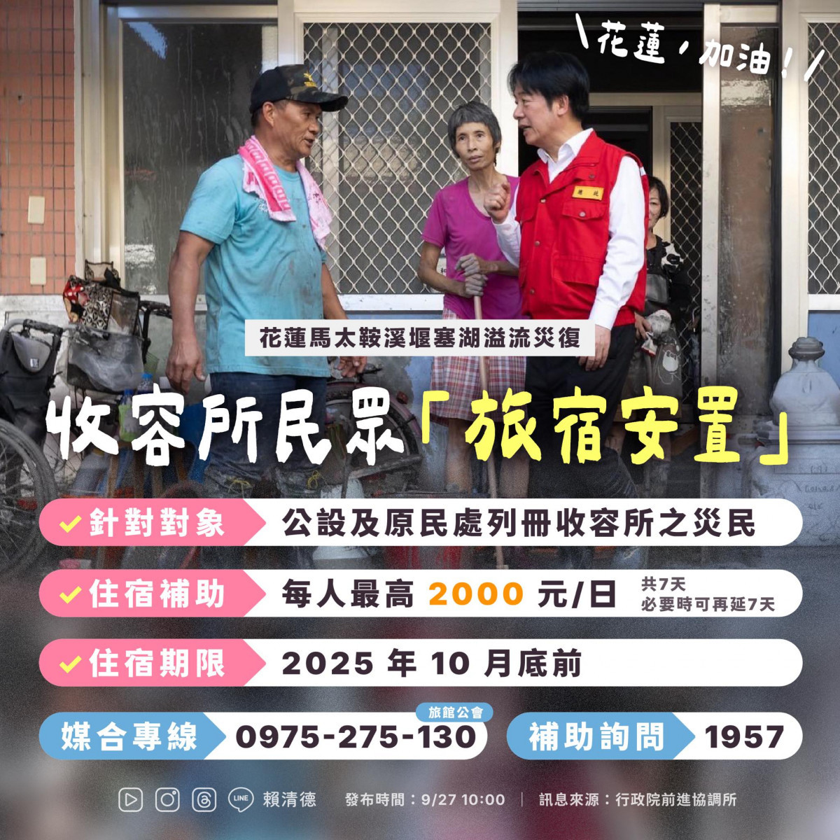 花蓮馬太鞍溪堰塞湖23日發生溢流釀成嚴重災情,總統賴清德日前視察洪災時向災民允諾,災民在這段時間若有短期住宿需求,將由中央政府負擔。賴清德今(27)日表示,政府已提出「旅宿安置」支持方案,每人每日最高補助 2,000 元,預計補助 7 天,最多可再延長7天。