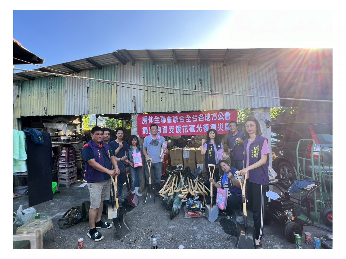 房仲全聯會號召全台房仲公會發揮互助精神,籌措並捐贈圓鍬、刮板、斗車等清理工具各百餘支,以及口罩、毛巾、雨衣、防寒衣等物資。此次行動集結了六都、台灣省聯合會與各縣市房仲公會的力量,包括台北市公會理事長蘇金城、高雄市公會理事長郎德明、新北市公會理事長林平川、桃園市公會理事長蕭順智、臺中市公會理事長林志雲、臺南市公會理事長鄭淵臨、台灣省聯合會理事長邱奕勝,以及各縣市房仲公會,都義無反顧加入捐助行列,其中宜蘭縣房仲公會理事長陳振坤更率領理監事團隊,連夜採購物資送往花蓮,再由花蓮縣房仲公會理事長韓林梅轉送至災區,讓救援與清理工作得以及時推進。