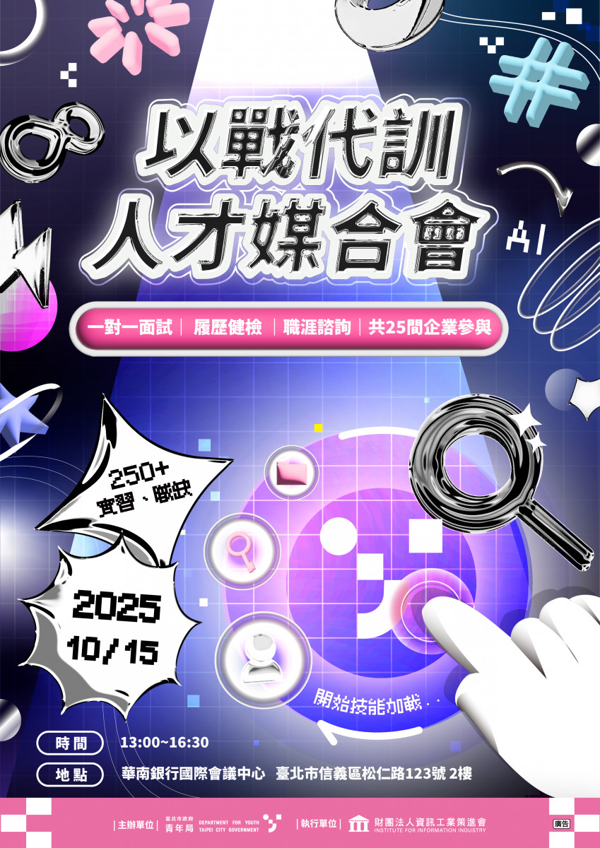 臺北市政府青年局為積極協助青年縮短學用落差、加速與職場接軌,將於10月15日(星期三)在華南國際會議中心舉辦「以戰代訓人才媒合會」。這場活動是青年局「青年以戰代訓職場銜接計畫」的成果展現,該計畫主張「實戰取代傳統訓練」,為學子與社會新鮮人打造一條「即學即用、即戰即上」的實務學習路徑。