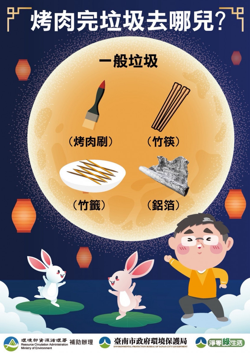 環保局表示,包括免洗筷、鋁箔紙、竹籤(需折斷)、刷具、玉米葉梗、海鮮殼、骨頭屬一般垃圾;免洗杯盤、飲料杯及烤肉夾、烤肉架、燃燒殆盡的仙女棒則為資源回收物,請先清洗再交給回收車。若有未吃完的食物,請瀝乾水份投入垃圾車後方廚餘桶。