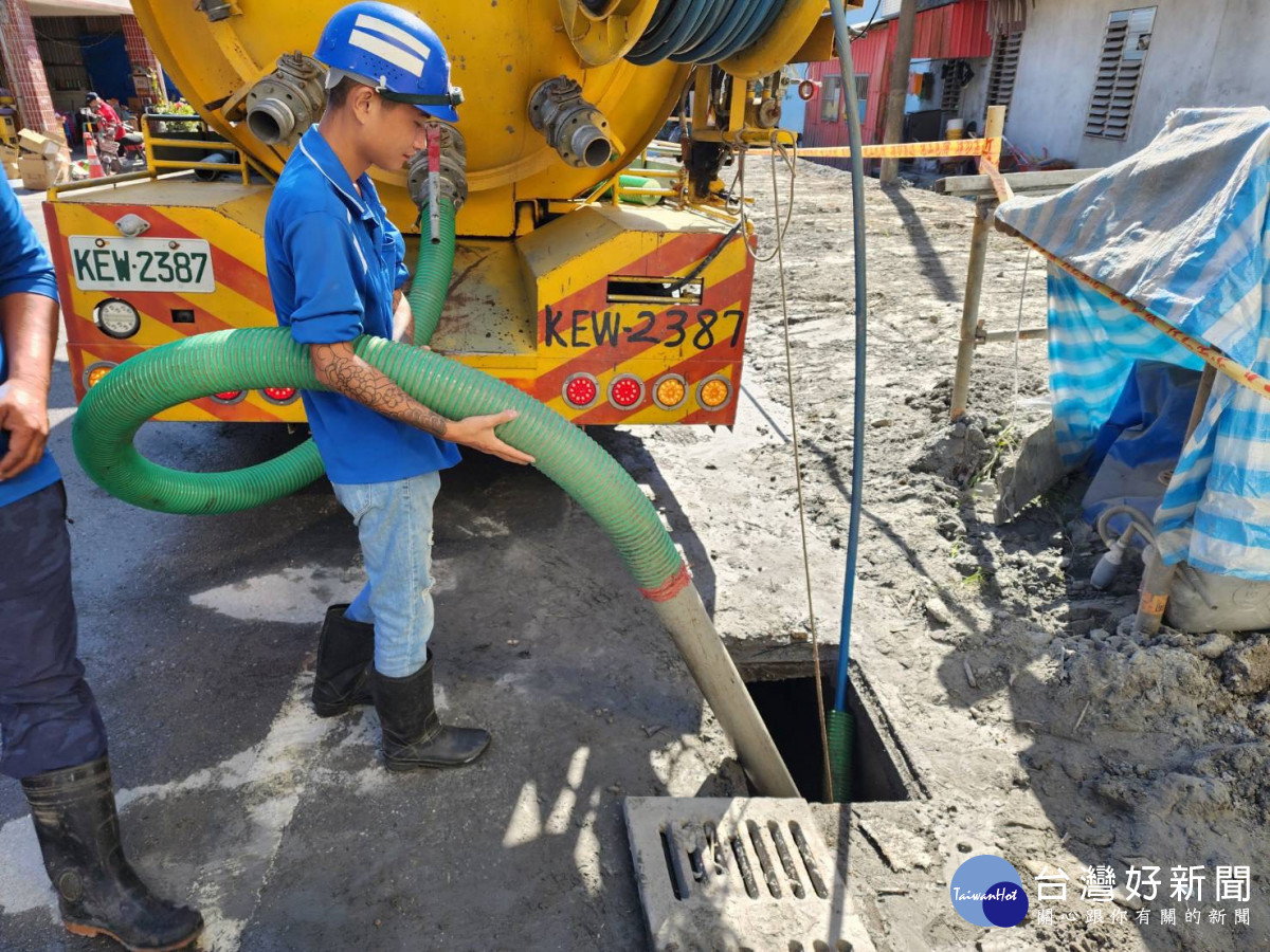 水利局長邱忠川表示,高壓吸泥車利用機械原理,可以吸取及沖洗方式迅速清理下水道與側溝淤泥,快速恢復市區排水功能。水利局響應黃偉哲市長發揮同島一命、人溺己溺之精神,再次調派2輛14噸高壓吸泥車及2部貨車,另有工作人員8員。於國慶連假期間,犧牲休假馳援花蓮,加入災害應變中心統一調度,支援團隊現已挺進靠近馬太鞍溪堤坊之武昌街一帶,清理巷弄內狹窄側溝淤泥,加速排空側溝,也配合水電志工協助,恢復民眾用戶排水順暢,早日回歸正常生活。