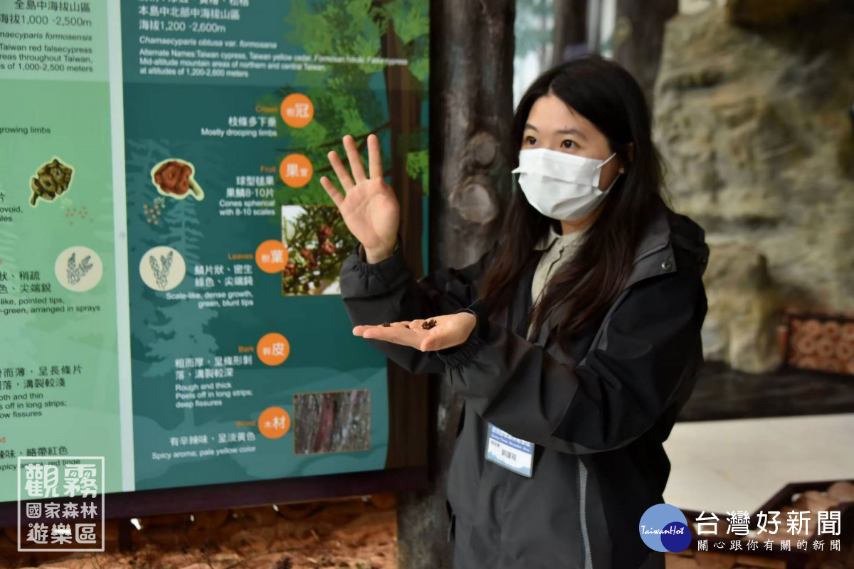 在專業解說員的帶領下,透過館內導覽認識觀霧森林的樹木組成與生態故事(森之形自然教育團隊提供;陳柏璋攝)