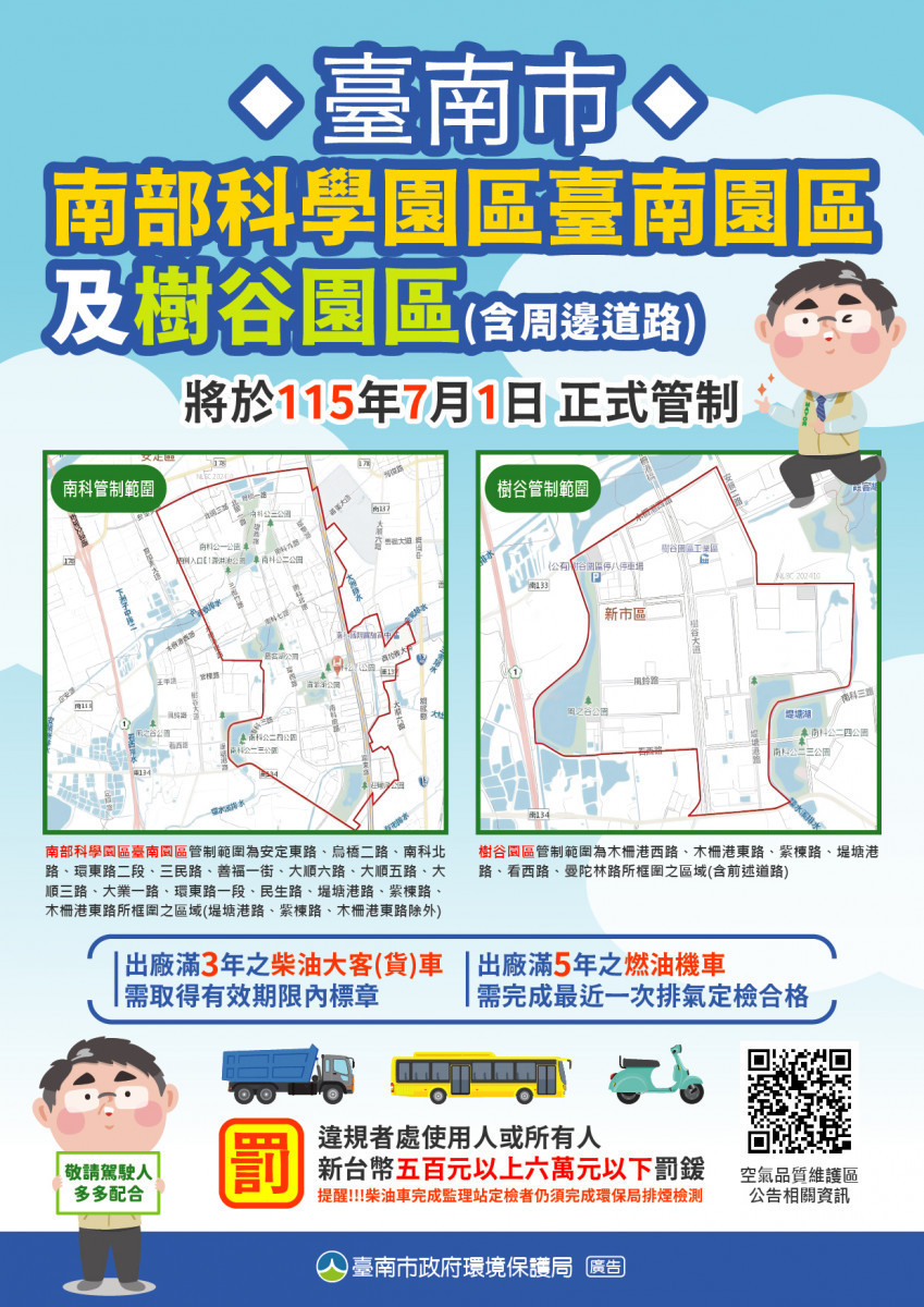 環保局說明,為配合114年新劃設的「南科園區」及「樹谷園區」空氣品質維護區政策,管制範圍將涵蓋周邊道路,並已啟動緩衝期宣導,提醒車主儘早完成相關檢驗。目前透過圖卡、宣導影片與官方臉書多元管道加強宣導,並提供機車簡訊提醒登記服務(https://reurl.cc/WOZmXD),柴油車主則可聯繫該局辦理登記(06-2686751#1508),避免因疏忽逾期受罰。