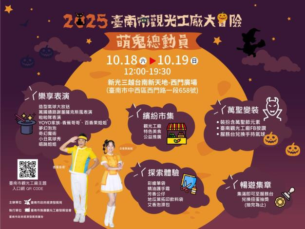 臺南市政府攜手在地觀光工廠,共同打造城市萬聖節氛圍,訂於10月18日至10月19日在新光三越台南西門店-西門廣場舉辦「臺南市觀光工廠大冒險 萌鬼總動員嘉年華」。活動以奇幻冒險結合萬聖萌鬼為主題,邀請大小朋友一起進入觀光工廠,展開一場兼具知識性、趣味性與互動性的探索之旅。