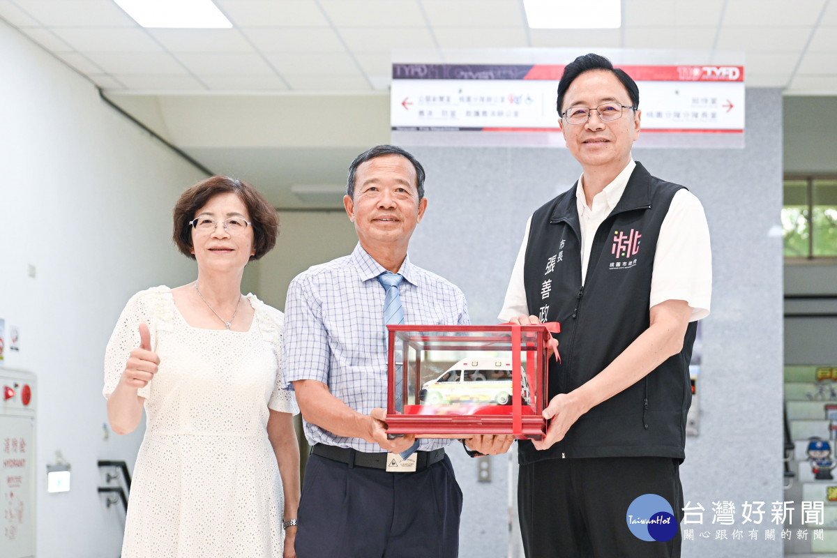 林坤言先生及呂定蓉女士捐贈消防局救護車捐贈典禮,市長張善政回贈感謝狀及救護車模型。