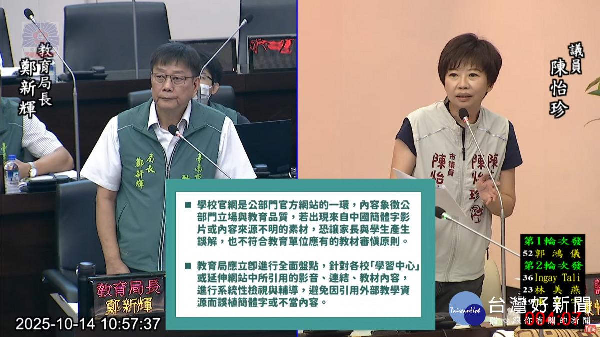 陳怡珍說,即便是學校自發製作的內容,市府教育局仍應負有監督及輔導責任。學校官網是公部門官方網站的一環,內容象徵公部門立場與教育品質,若出現來自中國簡體字影片或內容來源不明的素材,恐讓家長與學生產生誤解,也不符合教育單位應有的教材審慎原則。