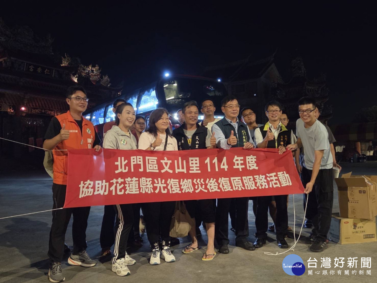 為支援花蓮縣光復鄉堰塞湖溢流所致災情,台南市政府15日凌晨再度擴大動員,媒合市內緊急救援隊,於零時三十分出發,前進光復鄉佛祖街執行任務,協助地方加速救援與復原工作。北門區文山里亦在李英信里長主動號召下,里民展現人溺己溺精神,與緊急救援隊伍協同前往支援。