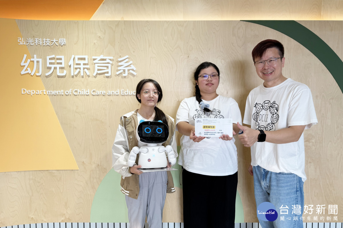 弘光科技大學幼兒保育系大二學生王汶卉、林宜婷和學姊黃怡真,在助理教授許紋華鼓勵下,參加114年教育部指導舉辦的「凱比機器人跨域應用競賽」,所設計教案「凱比交通小英雄」,應用可愛機器人語音互動和問答讓兒童學習過馬路等交通安全的知識,於大專跨域組中榮獲創新優等獎。