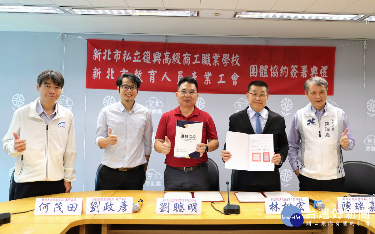 新北市教育人員產業工會今(17)日與復興商工舉行首份團體協約簽署儀式,在勞工局長陳瑞嘉、教育局專委何茂田、勞動部關係司專委劉政彥共同見證下,由復興商工副校長劉聰明、新北教產理事長林松宏代表簽署,重要內容包括教師學術研究加給、基本授課節數比照公立學校標準,以及提高導師職務加給等。這份經過2年馬拉松式協商產生的團協,不僅展現了勞資雙方堅守誠信協商的決心,更讓私校教職員勞動權益跨出一大步,值得掌聲鼓勵。