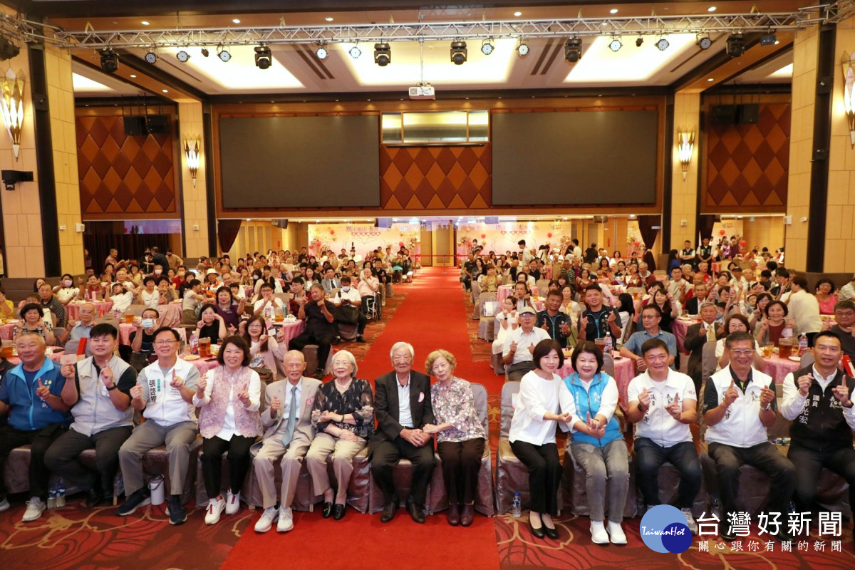 嘉義市府今(19)日上午在耐斯王子飯店舉辦「攜手相伴 長長久久」金婚禮讚活動,今年報名參加金婚長者婚齡超過60年有21對(其中婚齡70年有2對)、婚齡50至59年的有51對,共計72對幸福夫妻共襄盛舉。市長黃敏惠與議長陳姿妏、立委張啟楷及多位議員出席活動,為金婚的阿公阿嬤送上祝福,並共同合影紀錄這幸福時刻。