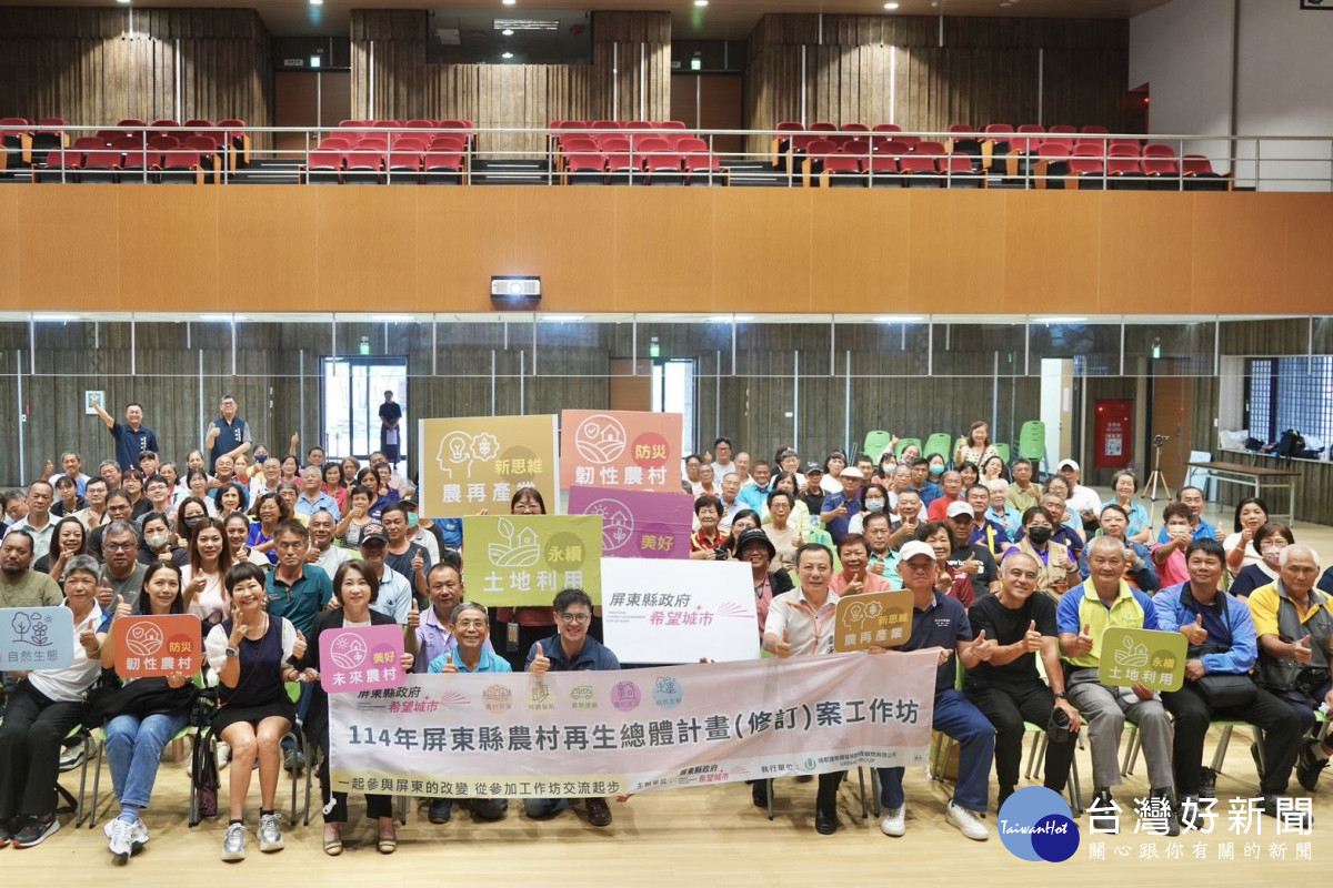 農業部農村及水土保持署今(114)年度啟動全國縣市層級的農村再生總體計畫修訂,屏東縣政府配合國土計畫,21日在縣府大禮堂舉辦本年度最後一場工作坊,由縣長周春米邀集各鄉鎮市公所、社區發展協會、地方創生團隊、社區規劃師、青農聯誼會等單位參與,盼透過意見整合與交流,凝聚地方農村發展與願景。