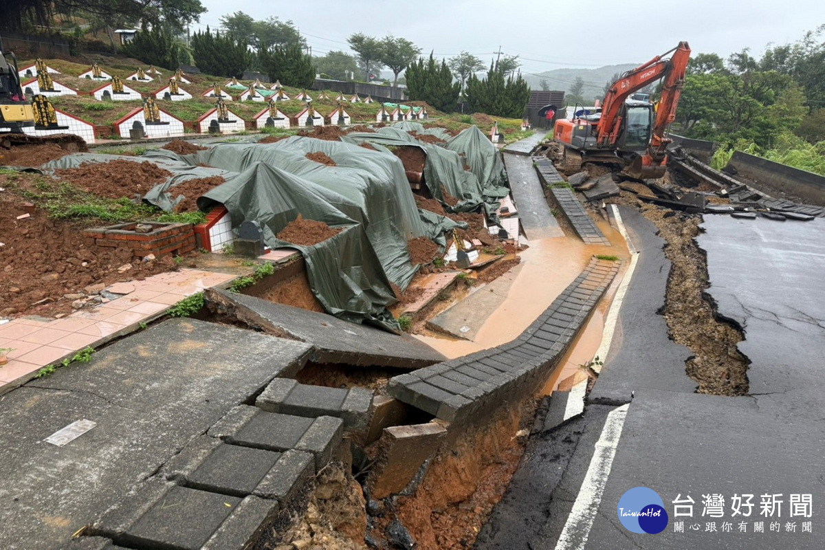 受「風神颱風」外圍環流及東北季風共伴影響,桃園地區連日降雨不斷。蘆竹生命紀念園區21日發生土葬區忠區坍方,造成墓基與道路受損,受影響墓座共計5門。蘆竹區公所接獲通報後,第一時間啟動應變機制,並聯繫家屬,於現場進行安全圍設及災損控管,確保現場安全。