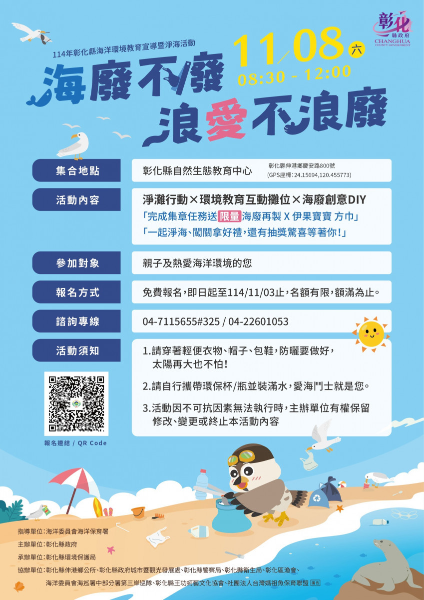 海洋是生命的搖籃,卻正面臨廢棄物污染的威脅。為推廣海洋保育觀念、喚起全民對海洋廢棄物議題的關注,彰化縣環境保護局將於11月8日(週六)上午8時30分至中午12時,在彰化縣自然生態教育中心(伸港鄉慶安路800號)舉辦「海廢不廢,浪愛不浪費!」114年彰化縣海洋環境教育宣導暨淨海活動,邀請民眾一同守護藍色國土。