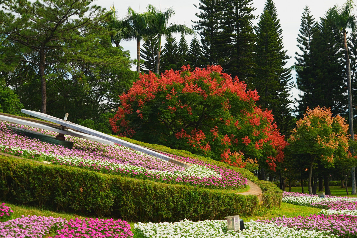 與花鐘的日日春花毯相互映襯的,是周邊正值結果期的臺灣欒樹。此時,欒樹枝頭結滿了紅色的果實,遠看像一串串小燈籠高掛樹梢,微風吹拂時搖曳生姿。