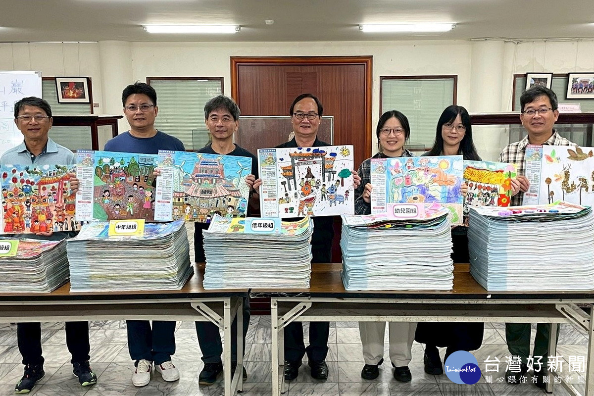 值得一提的是,本次評選過程中,中年級組競爭最為激烈,畫作緊扣主題且各有千秋,讓評審難以取捨。評審劉麗玉老師讚許今年作品「完整度歷屆最佳」,技巧成熟且結合複合媒材、透視構圖展現創意。陳曉峰老師則對許多細節滿滿的作品印象深刻,孩子們將台灣特有種動物、農特產品紙箱等鄉土元素與神明互動巧妙融合,展現出紮實的美學素養與觀察力。