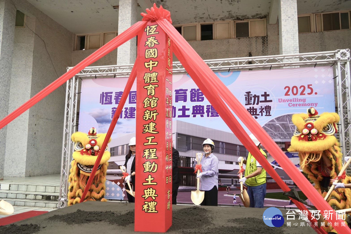 為打造師生安全、舒適的運動環境,屏東縣立恆春國中30日舉辦體育館新建工程動土典禮,縣長周春米主持典禮時表示,本工程由教育部補助1億2,395萬元、縣府自籌1億3,618萬元,總經費超過2億6,000萬元,預計116年3月完工,完工後可提供師生運動、教學與集會使用外,在落山風季節期間,更能成為恆春鄉親重要的運動空間,期待工程順利如期完成。