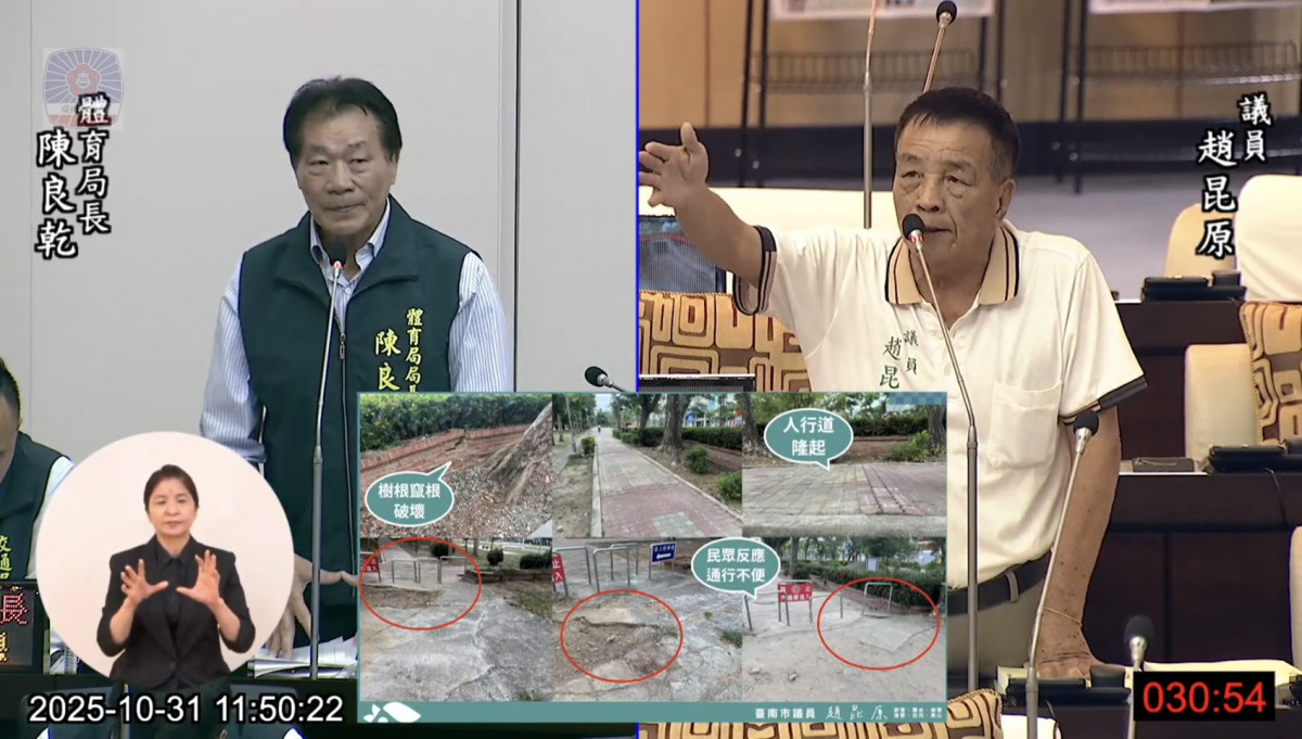 鹽水岸內排水長期飽受異味困擾,相關單位雖曾進行改善,但僅以鐵絲網圍設,整體景觀仍顯潦草,市議員趙昆原要求水利局與都發局加強清淤與景觀改善,重現鹽水蜂炮小鎮的古樸風貌。另外新營體育公園景觀改善,趙昆原指出,該處是居民日常運動與休憩的重要空間,但夜間照明不足、園區昏暗,亟需改善,要求體育局重新檢討整體規畫,優化人行動線、無障礙設計及指標系統,同時園區內多處樹木根系外露、竄根嚴重,導致人行步道破損,應儘速重新栽植合適樹種。