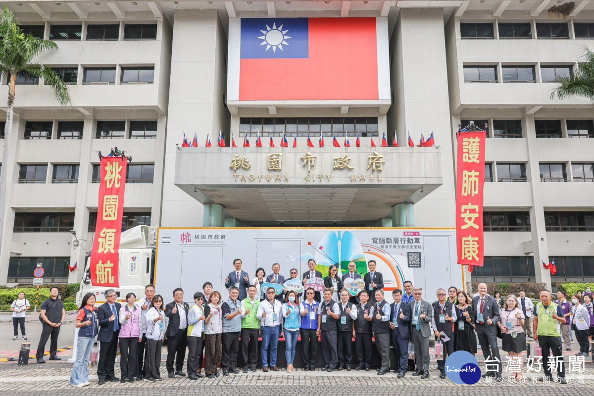 桃園市長張善政31日於市府前廣場,出席「全國首創行動CT醫療車啟用記者會」。張市長表示,此輛價值約6,000萬元的行動電腦斷層(CT)醫療車,是全國首輛合法上路並具放射線檢查功能的車輛,從設計、製造到通過衛生福利部、核能安全委員會及交通部審核,歷經多次修正與測試,最終在副市長王明鉅及市府團隊努力下順利誕生,落實醫療走出去、市民更健康的目標。