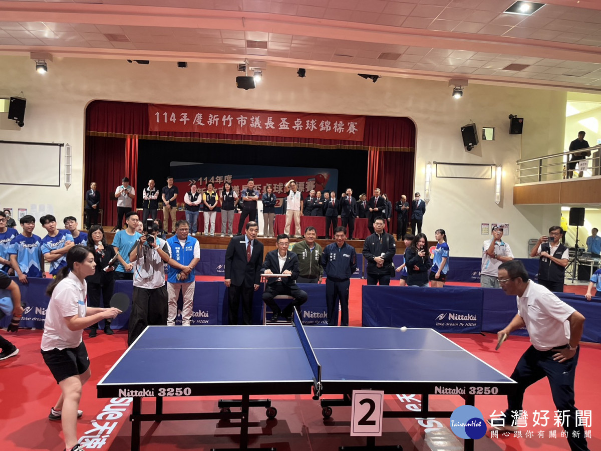 「新竹市議長盃桌球賽」1日在北區民富國小登場,賽事共分公開組、長青組、機關組及國小男女甲乙組等7大組別,吸引各路好手同場較勁。開幕儀式中,許修睿議長擔任主審,邱臣遠代理市長擔任副主審,邀請高虹安市長與余邦彥副議長開球儀式,賽後並在客製球拍上簽名,正式為新竹市議長盃桌球賽揭開序幕。