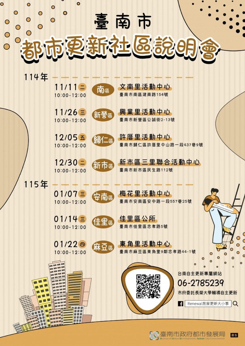 台南市府都發局為協助市民了解都市更新相關補助政策與辦理流程,繼於114年7月至10月辦理7場次都市更新社區說明會,獲得民眾熱烈反應後,又將於114年11月11日起啟動第二階段都市更新社區說明會,陸續在南區、新營區、歸仁區、新市區、安南區、佳里區及麻豆區等地舉辦共7場次,有意了解自主更新的民眾,請踴躍報名參與。