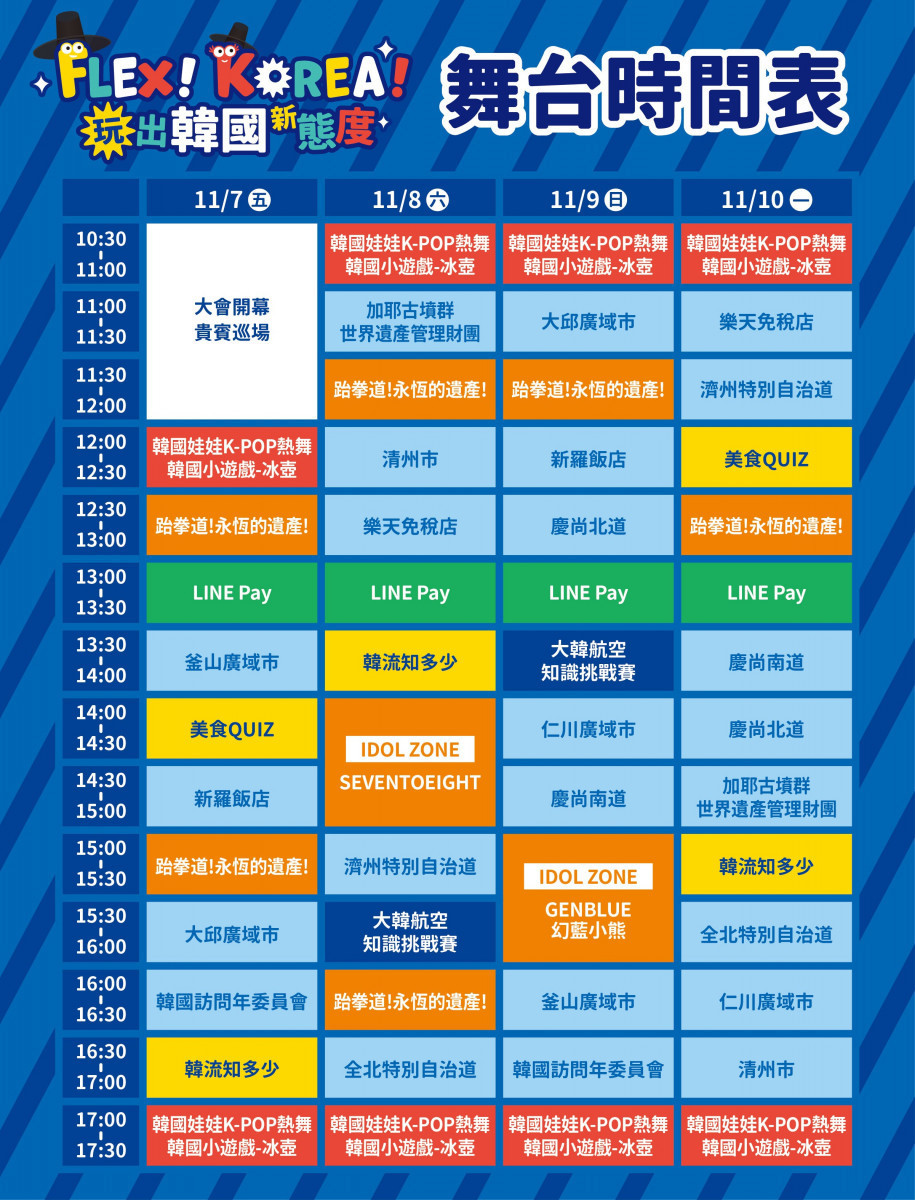 K-POP 互動: 於11/8(六)與 11/9(日)分別邀請從台韓合製選秀節目《SCOOL》脫穎而出的男團 SEVENTOEIGHT,以及甫發行新專輯的 GenZ 人氣女團 GENBLUE 幻藍小熊。兩組團體將在現場與粉絲互動,分享 MZ 世代最潮的韓國旅遊體驗。
