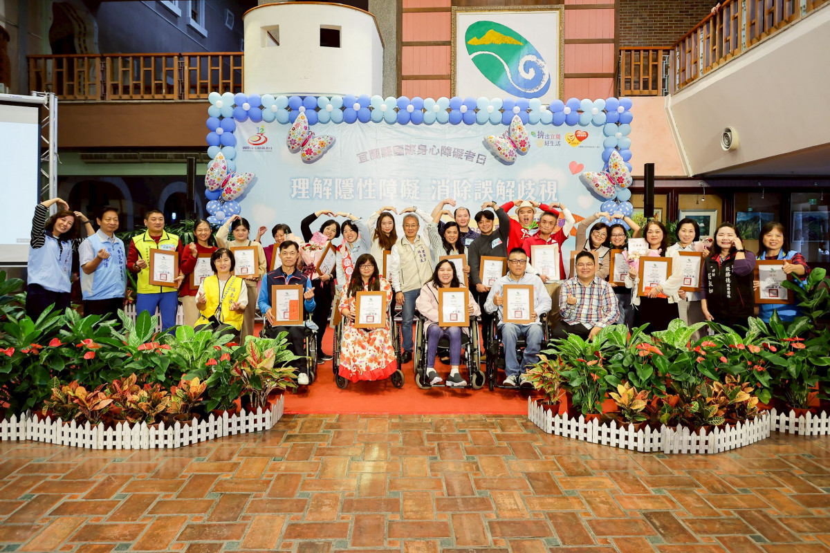 宜蘭縣政府為慶祝2025年國際身心障礙者日,結合社團法人宜蘭縣騏翔社福協會以「理解隱性障礙 消除誤解歧視」為主軸,舉辦系列活動,4日在縣府縣民大廳辦理勁勇獎表揚,邀請縣內身心障礙朋友及其家屬、身心障礙機構團體及社會大眾參加頒獎典禮,為得獎者喝采,一起關心身心障礙者權益。