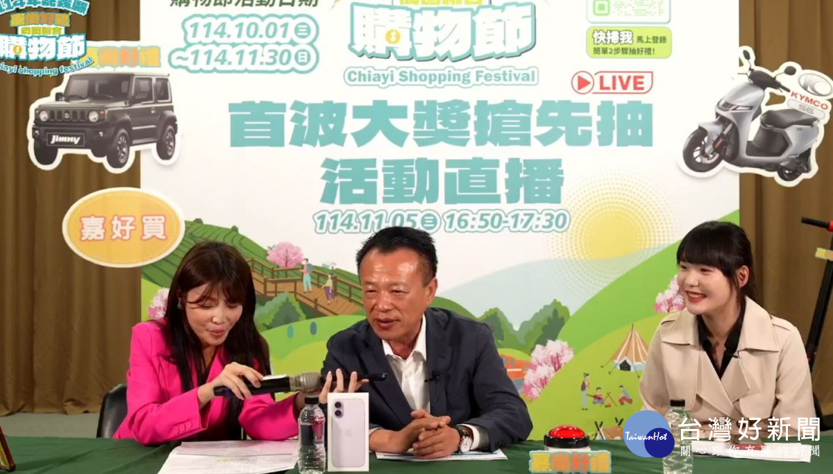 由嘉義縣政府主辦的「114年嘉義縣商圈聯合購物節-嘉尚好禮」活動,自10月1日盛大開跑以來,買氣持續強強滾。活動已進入第二個月,為感謝廣大消費者的熱烈支持,縣府今日(11月5日)舉辦首波大獎的線上直播抽獎活動,由縣長翁章梁親自抽出JIMNY吉普車、環保電動機車、iPhone17等好禮,將活動熱度推向最高點。
