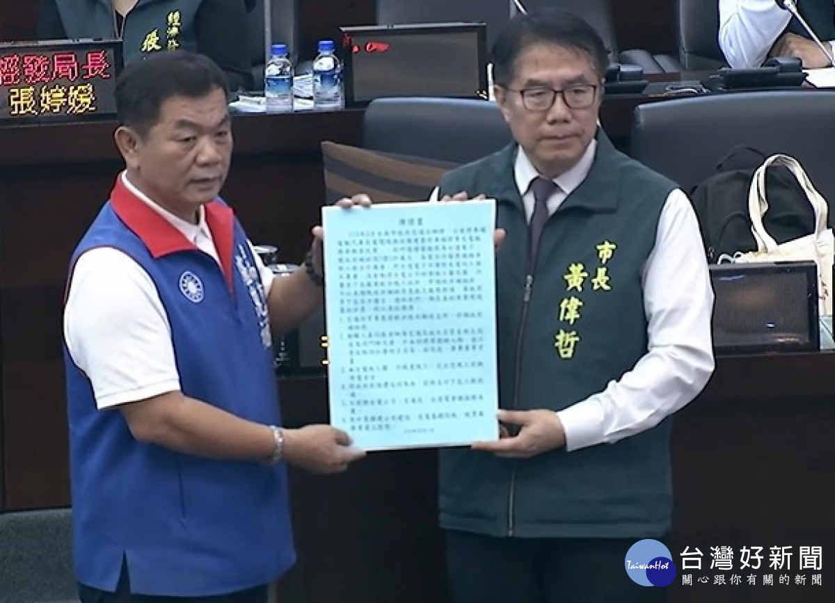 台南市議員盧崑福(左)趁總質詢時遞交民眾檢舉函給台南市長黃偉哲(右),要求政風、法制等單位嚴懲不法。
