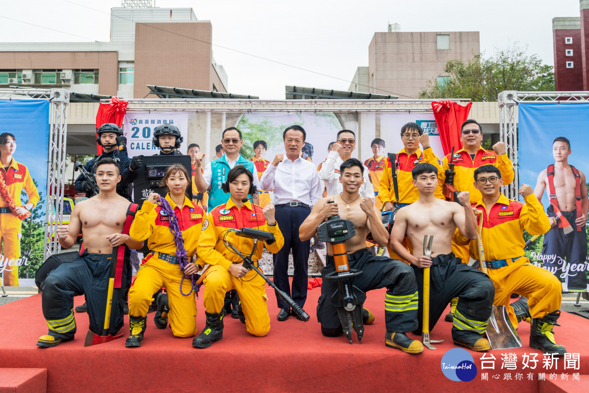 嘉義縣長翁章梁、消防局長蔡建安、副局長沈廷衡、警察局長李權哲、義消總隊總幹事呂文正、溪口防宣分隊長劉惠萍等貴賓一同揭開馬年猛男桌曆首發,喊出口號「馬上平安,消舞吉」,象徵消防、警察合作使命必達。