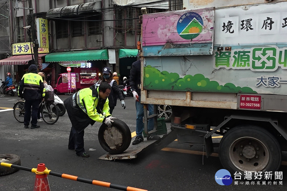 配合南門市場災後拆除工程進行,桃園市政府聯合稽查小組加強占用道路、違停等巡查。