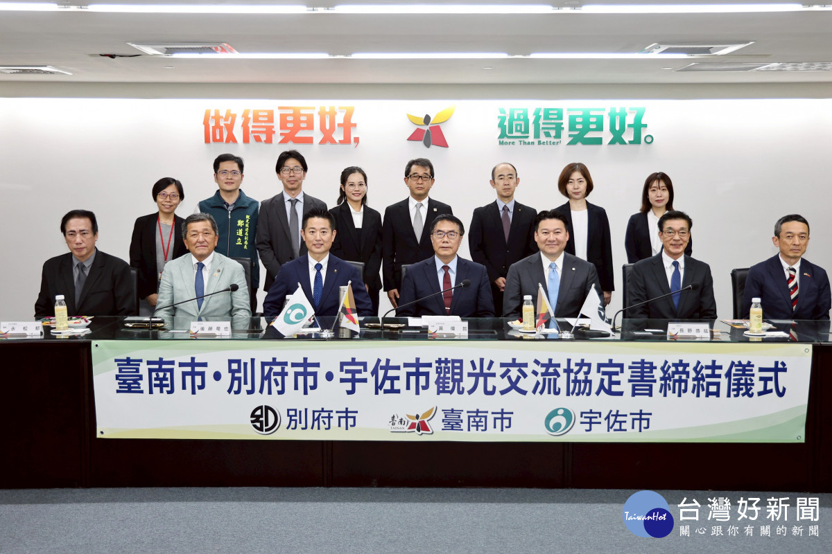 為促進觀光發展與交流合作,黃偉哲市長今(20)日與日本大分縣別府市長野恭紘市長、宇佐市後藤竜也市長,共同簽署「臺南市、別府市及宇佐市觀光交流協定書」。
