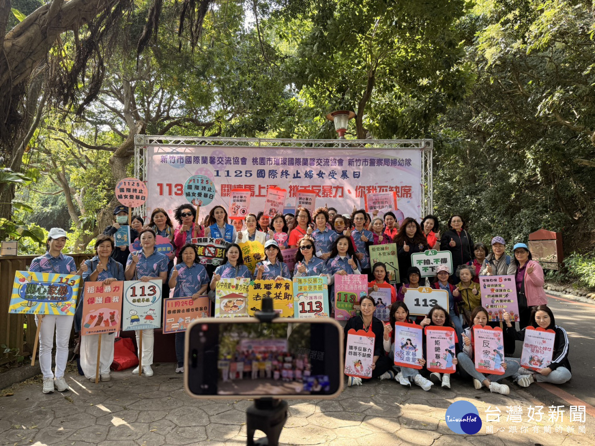 配合聯合國訂定1125為國際終止婦女受暴日,新竹市國際蘭馨交流協會25日與桃園市璀璨國際蘭馨交流協會於竹市十八尖山入口處共同舉辦「1125終止家庭職場暴力與販賣人口」全國45個分會連線宣導活動,呼籲面對暴力時,勇敢求救「113」。