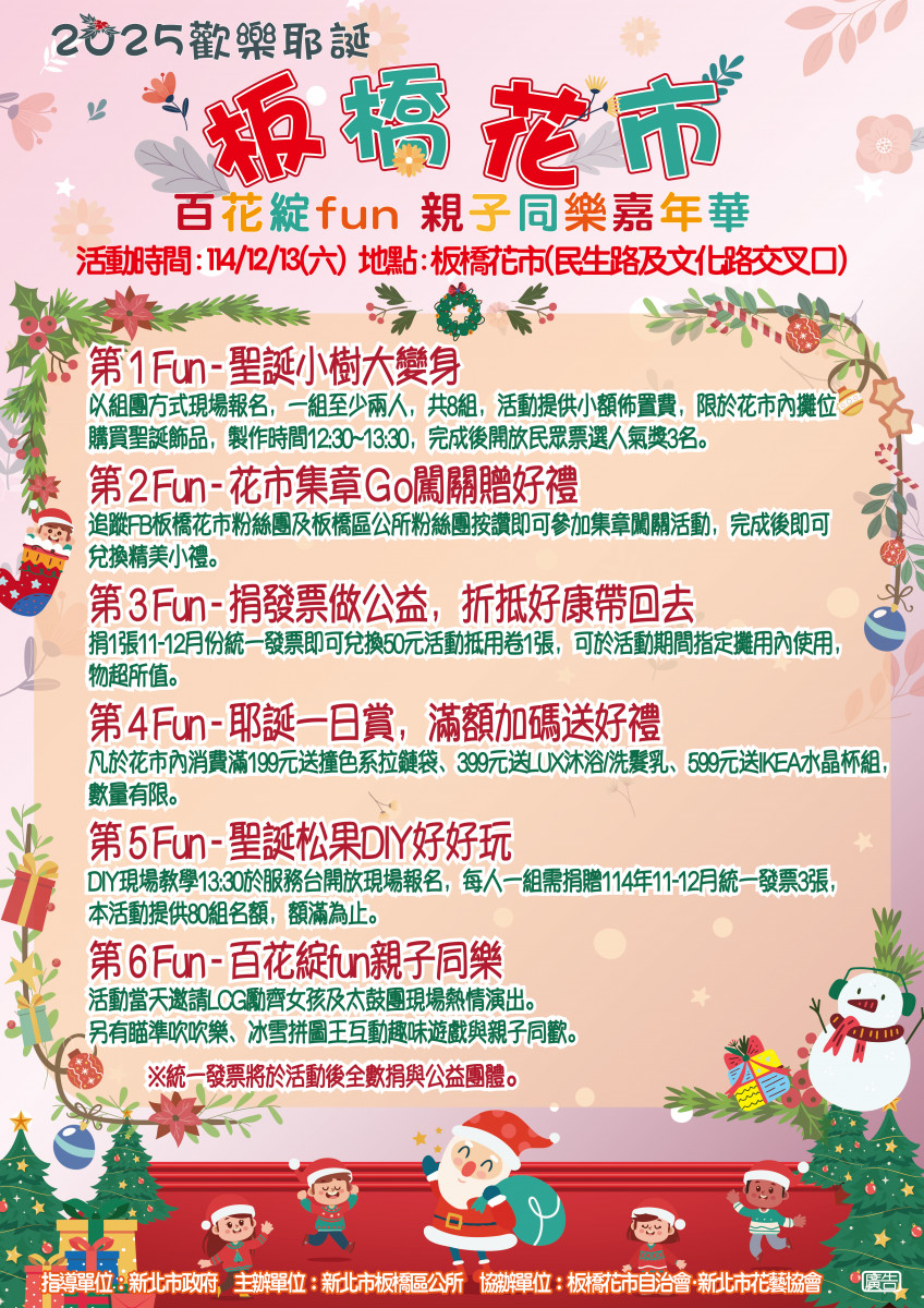 為迎接充滿溫馨的耶誕節,板橋區公所12月13日(六)於板橋花市舉辦「2025歡樂耶誕 板橋花市百花綻Fun 親子同樂嘉年華」,活動內容有聖誕限定DIY、聖誕小樹佈置競賽、滿額贈活動、花市集章Go闖關集好禮、活動抵用券、親子趣味競賽及舞台表演等豐富內容,邀請市民在花卉芬芳與節慶氛圍中,共享歡樂幸福的週末。