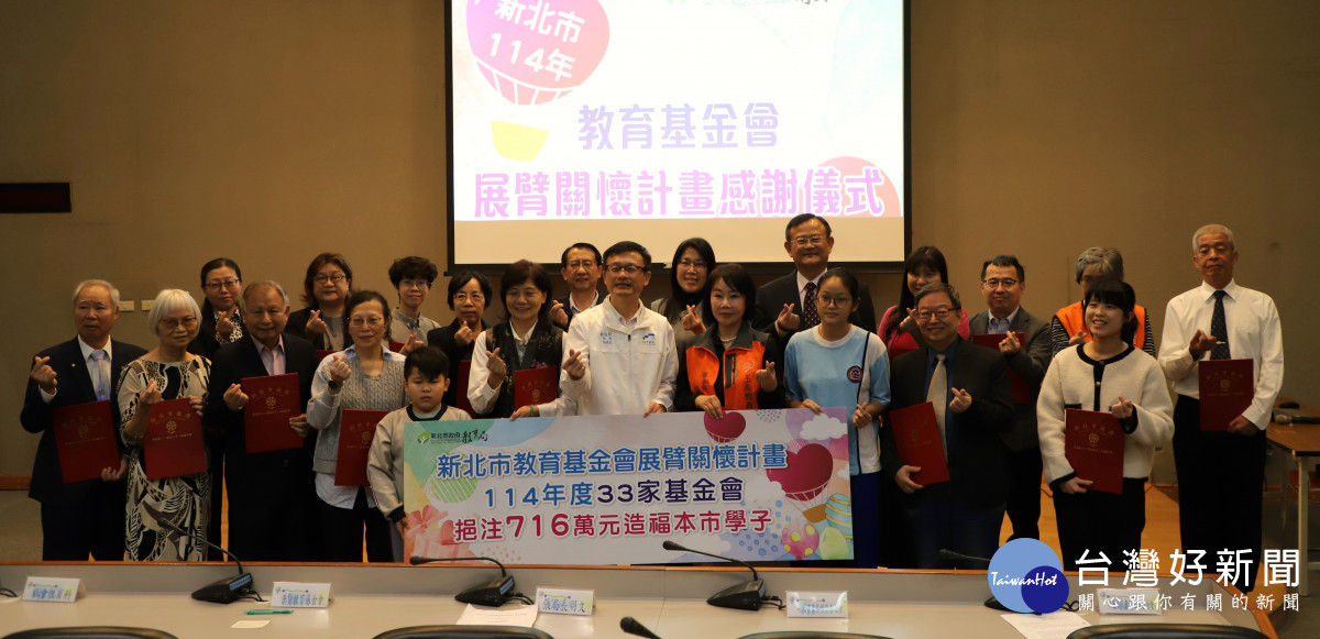 新北市教育局今(11)日舉辦「教育基金會展臂關懷計畫感謝儀式」,感謝今年共有33家教育基金會投入教育公益,捐助「新北市溫馨助學圓夢基金」及多項教育計畫,年度總金額達716萬元。教育局長張明文親頒感謝狀,肯定各基金會的長期投入,讓跨界公益成為支撐弱勢學子前進的力量。