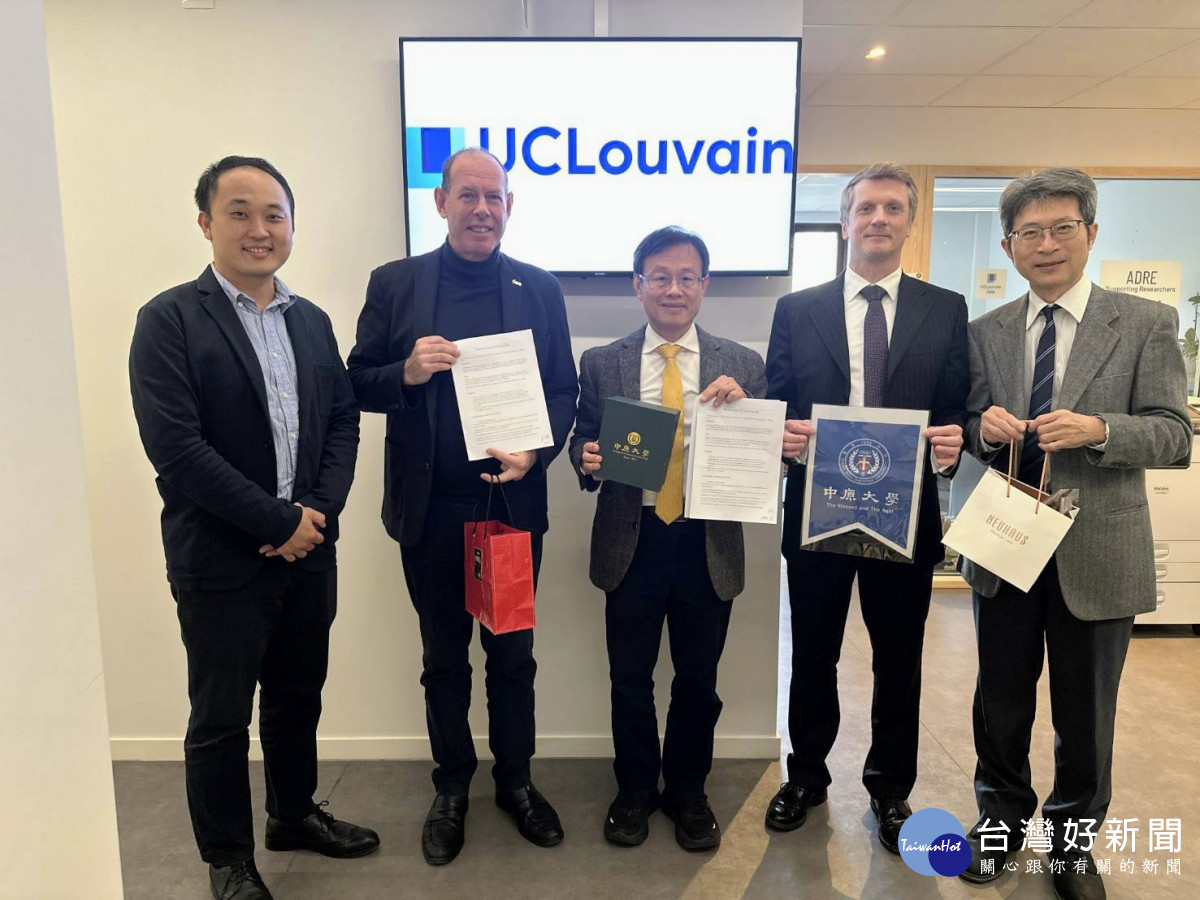 中原大學副校長吳宗遠(右一)率團赴比利時UC Louvain,與WINFAB團隊簽署合作備忘錄。(右起:中原副校長吳宗遠、WINFAB經理Christian Renaux、中原半導體學院院長傅昭銘、UC Louvain研發處主任Xavier Lepot、中原學士學程主任郭泰辰)