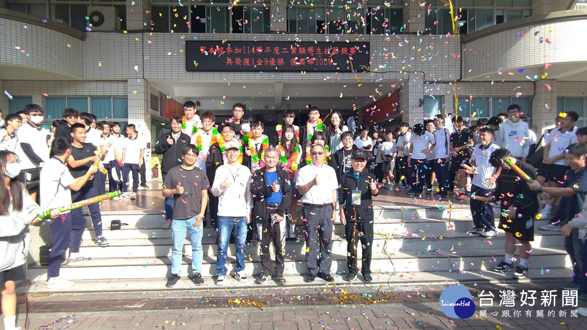 員林崇實高工今年在競爭激烈的全國賽場上寫下傳奇,不僅創下「獲獎數歷年最多(1金9優勝)」與「參賽選手獲獎率100%」的二項校史新紀錄,更展現了全校團結一心的氣勢。這場英雄式的歡迎儀式,正是對師生們日夜苦練、為校爭光最高的致敬。