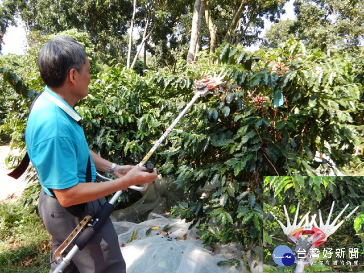手持咖啡採收機。林重鎣翻
