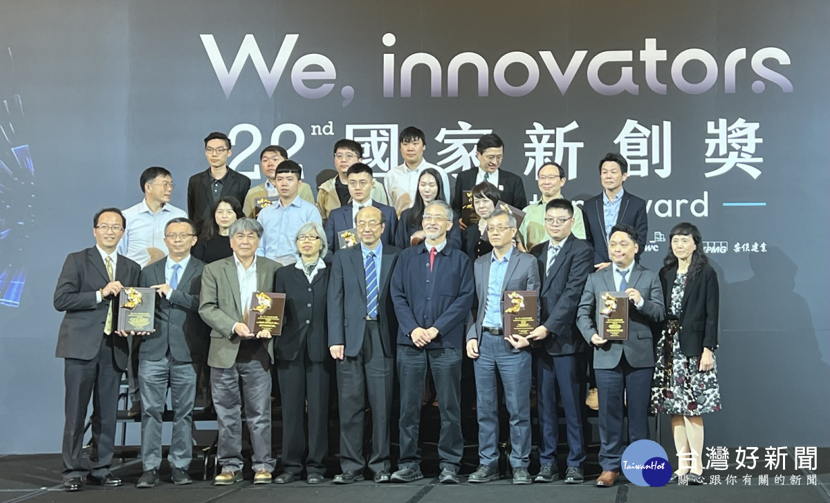 第22屆國家新創獎頒獎典禮,中原大學醫工系林政鞍(前排左一)與兆強科技董事長潘佳憶(前排左二)代表團隊上台領獎。