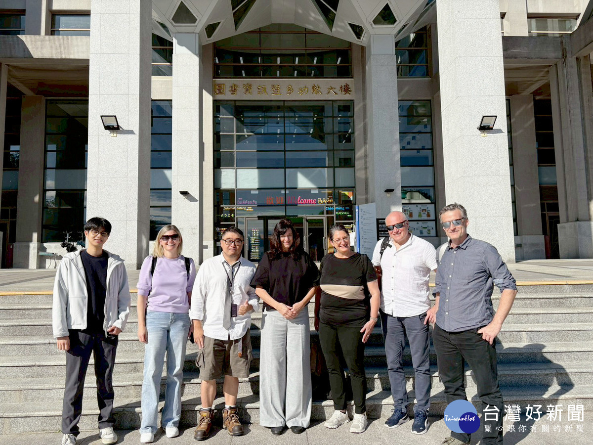 國際處組員鄭昀昕(左起)、Claudia Zeppetzauer教授、外文系徐孝先老師、Sandra Bellet教授兼國際交流主任、Simone Naphegyi教授、與Karl Peb?ck教授、Thomas Schroffenegger教授,於暨大圖書資訊暨多功能大樓前合影。(暨大提供)