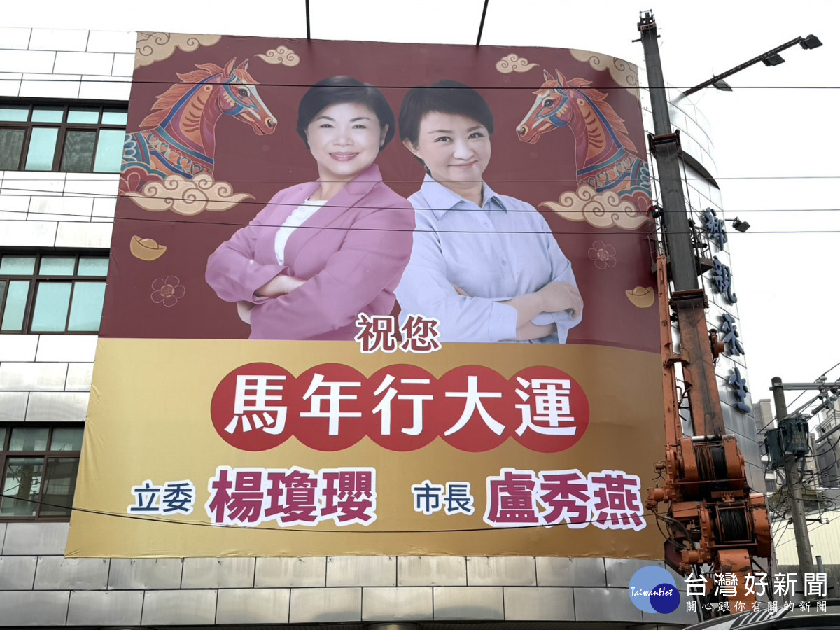 立委楊瓊瓔推出「馬年行大運」賀年看板,與台中市長盧秀燕同框。
