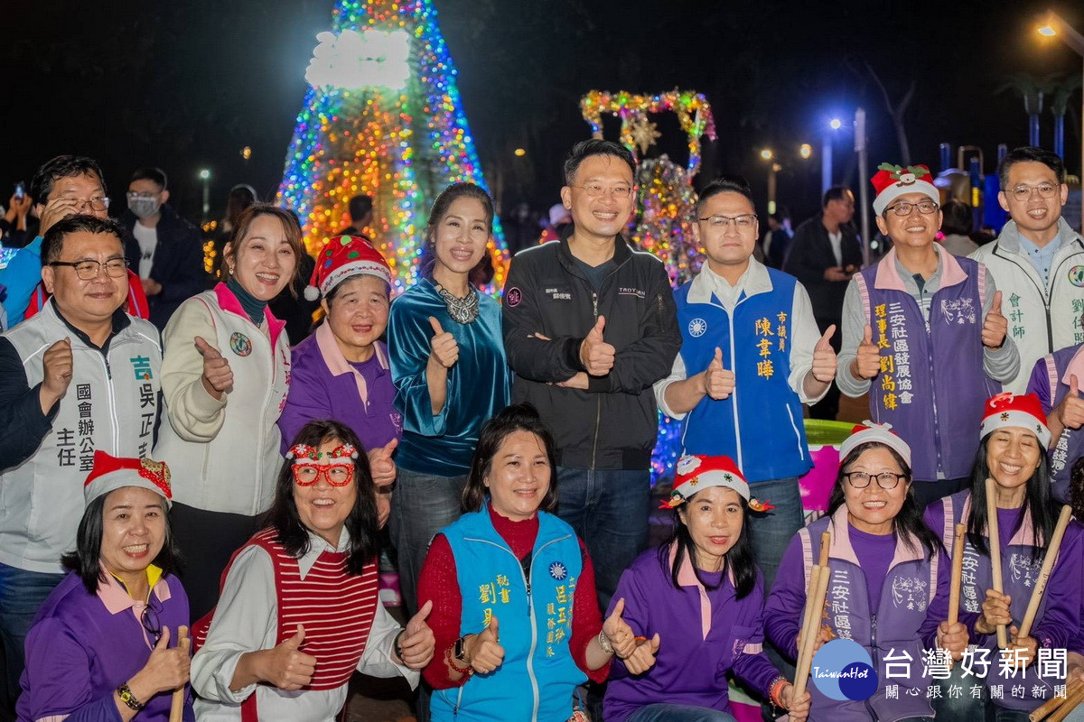蘇俊賓指出,今年活動最吸睛的聖誕樹,是由社區志工跨里合作、收集近1,500支廢棄玻璃瓶打造而成。早在11月初,他已偕同舒翠玲、陳韋曄議員與三安社區發展協會的里長及志工們共同清洗玻璃瓶並組裝環保聖誕樹,在社區夥伴的努力之下,今天順利點燈,蘇俊賓表示,這不僅是美學的呈現,更是環保意識的具體實踐,讓廢棄物轉化為點燈儀式中最閃耀的藝術品,賦予資源第二生命。