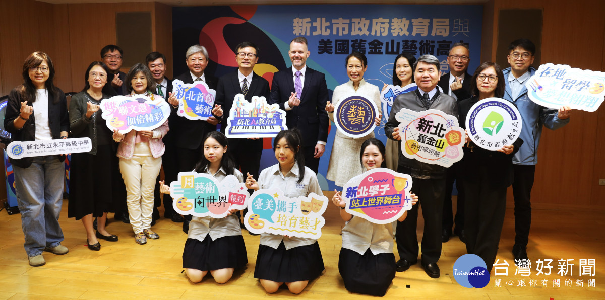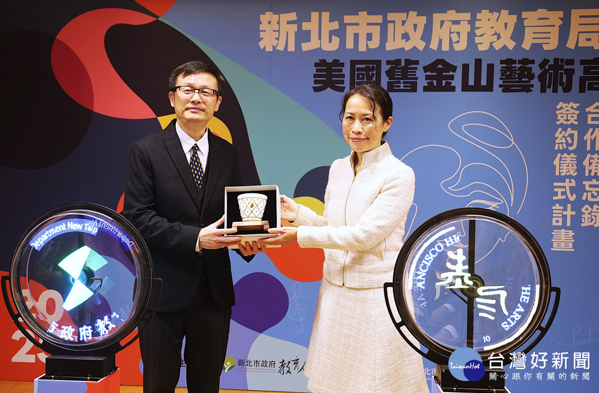 新北市教育局今(22)日與美國舊金山藝術高中正式簽署合作備忘錄,教育局長張明文與舊金山藝術高中校長 Dr. Sherry Zhang 代表簽署,美國在台協會(AIT)商務官Jeffrey Dutton亦親臨見證,同時宣布全國首創引進「藝術領域雙聯學制」,讓新北高中生就學期間,免出國即可線上修讀美國藝術高中課程,完成相關學習後可同時取得臺美雙邊高中文憑,為未來升學與藝術職涯奠定更具競爭力的國際基礎。