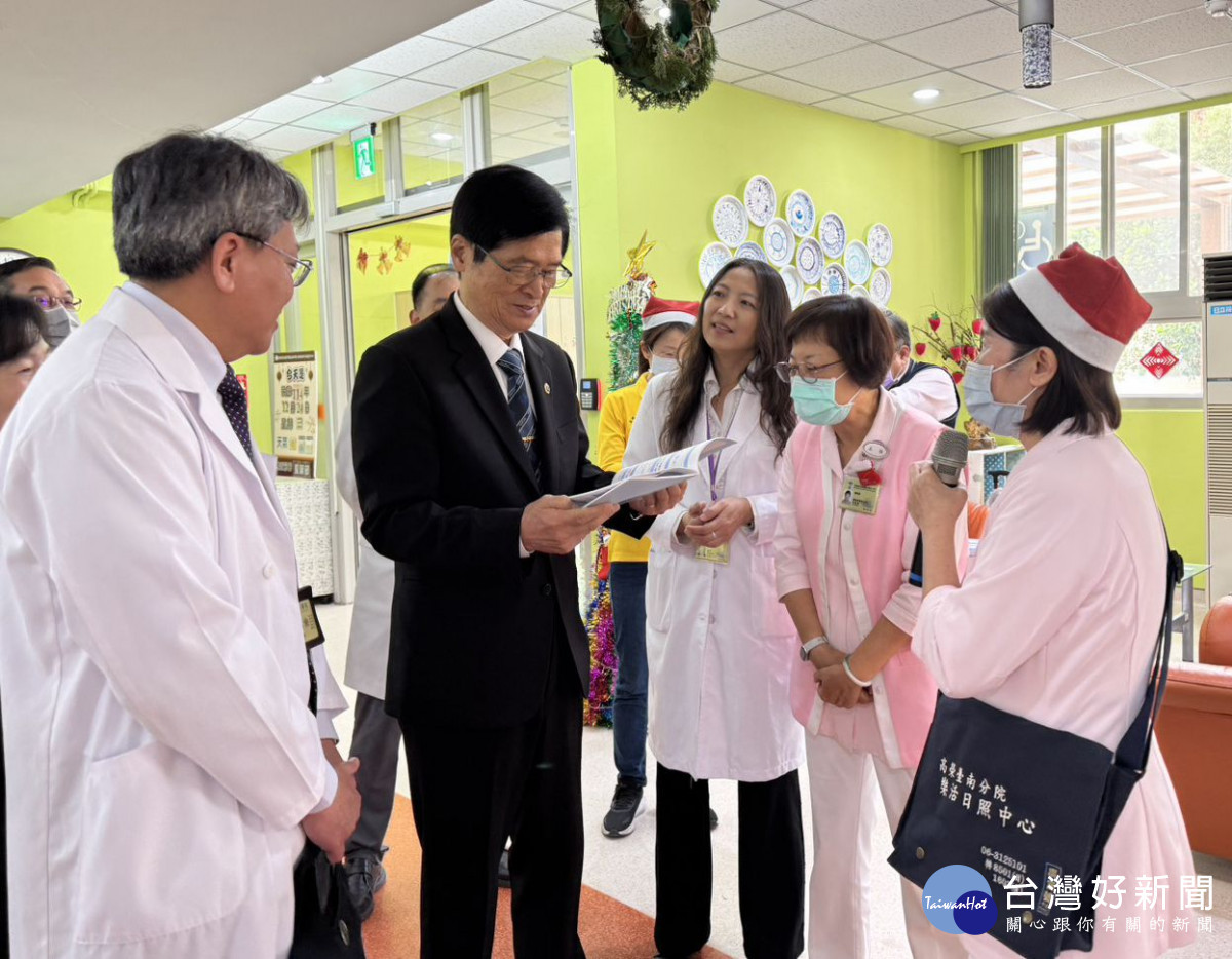 嚴德發主任委員實地暸解醫院推動「長照3.0」服務情形,如急性後期照護(PAC)復能服務、安寧善終、樂活日照中心運作及榮民就醫綠色通道執行成效,並視察高榮臺南分院與佳里榮家以遠距醫療照護榮民長輩,提供醫療可近性,對工作同仁們投入長照服務的努力,表示肯定與感謝。