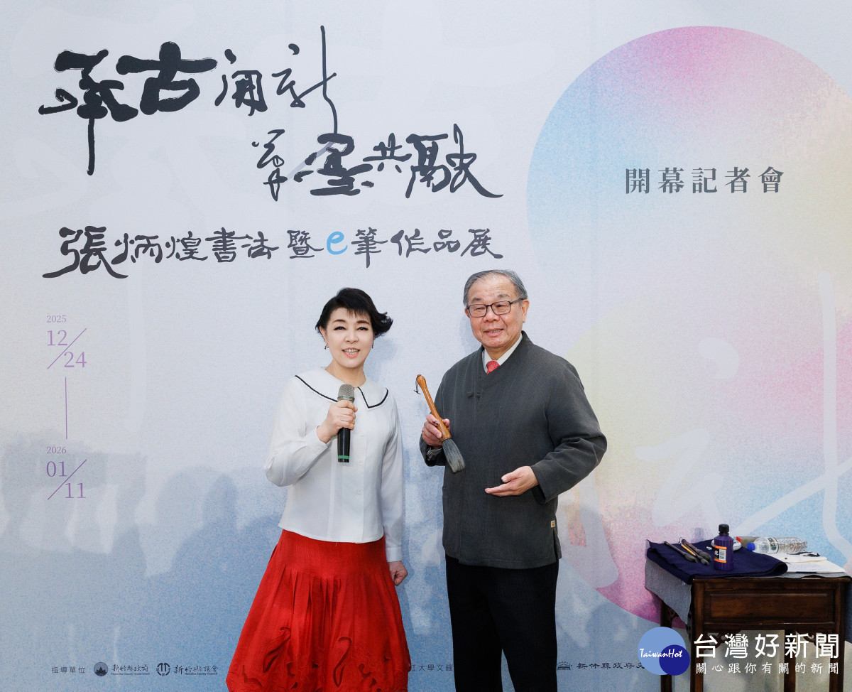 知名書法家張炳煌教授27日在新竹縣政府文化局美術館101展廳舉辦「承古開新、筆墨共融-書法暨e筆作品展」,開場由銅好樂團三重奏揭幕,而與張教授擁有多年深厚友誼的聲樂家簡文秀,特別專程趕赴新竹,高歌一曲〈又見炊煙〉結合張教授的書法揮毫,實為難得一見的跨域藝術聯動!