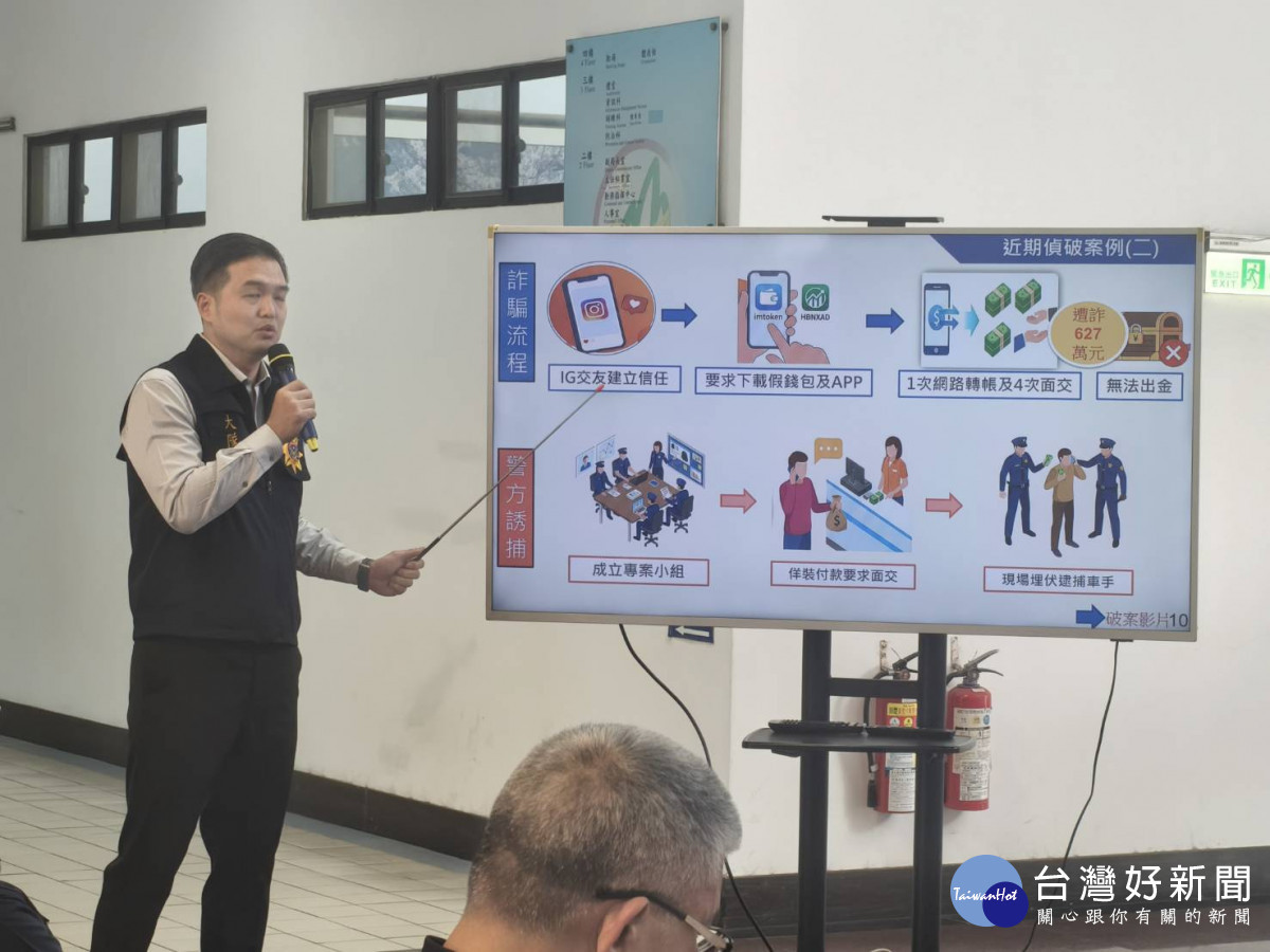 嘉義縣刑大大隊長翁士閔分析「詐騙金聊」手法,提醒民眾慎防詐騙。(圖/記者陳致愷攝影)
