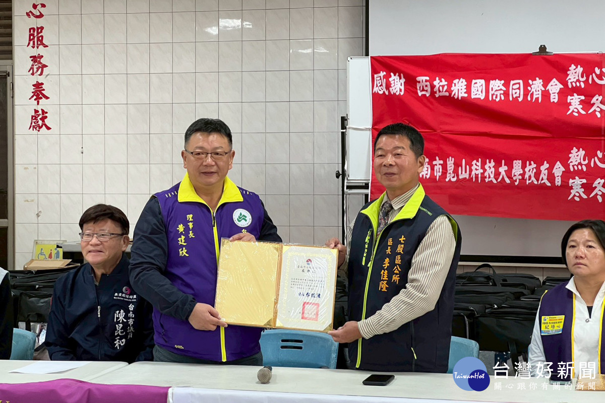 強烈大陸冷氣團來襲,氣溫急降,冷颼颼的天氣讓民眾感受到今年來前所未有的冷洌感。為助台南市七股區弱勢家庭過寒冬,西拉雅國際同濟會結合台南市崑山科大校友會致贈棉被給95戶弱勢家庭。市議員陳昆和表示,感謝2個單位長期深耕地方,以實際行動關懷弱勢家庭。七股區長李佳隆頒發感謝狀致謝,分別由紀培心會長、黃建欣理事長代表受贈。