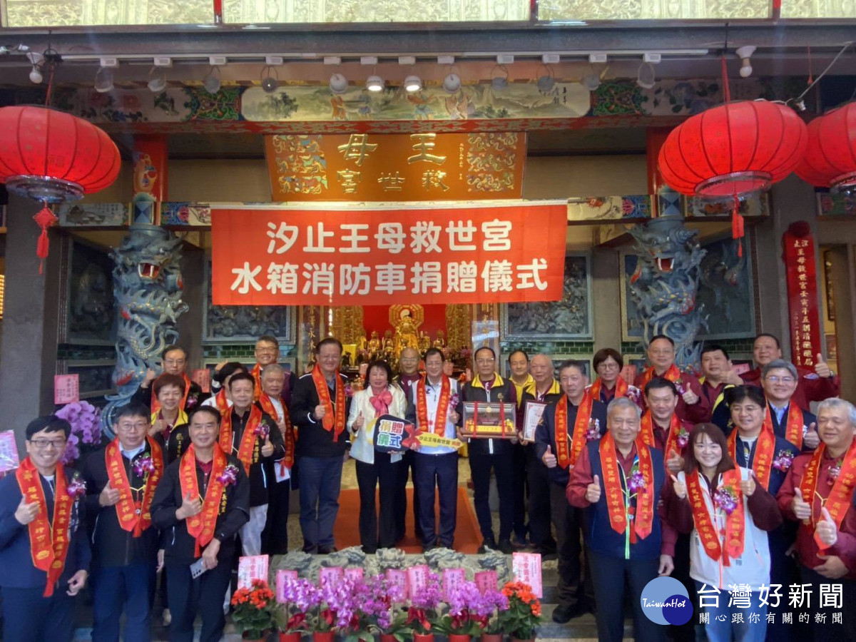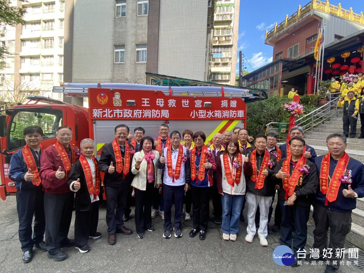 王母救世宮於2016年安座於汐止,供奉王母娘娘與金母娘娘,數年來不僅香火鼎盛,更以「慈悲救世、護佑眾生」為宗旨,長期投入社會公益,近年來已連續捐贈災情勘查車及多項裝備器材予警消團體。這次捐贈的水箱消防車為2噸級水箱車,配備高壓泵浦、可迅速於無消防栓地區獨立供水,特別適合汐止山坡地住宅、老舊社區巷弄及基隆河沿岸災害搶救。