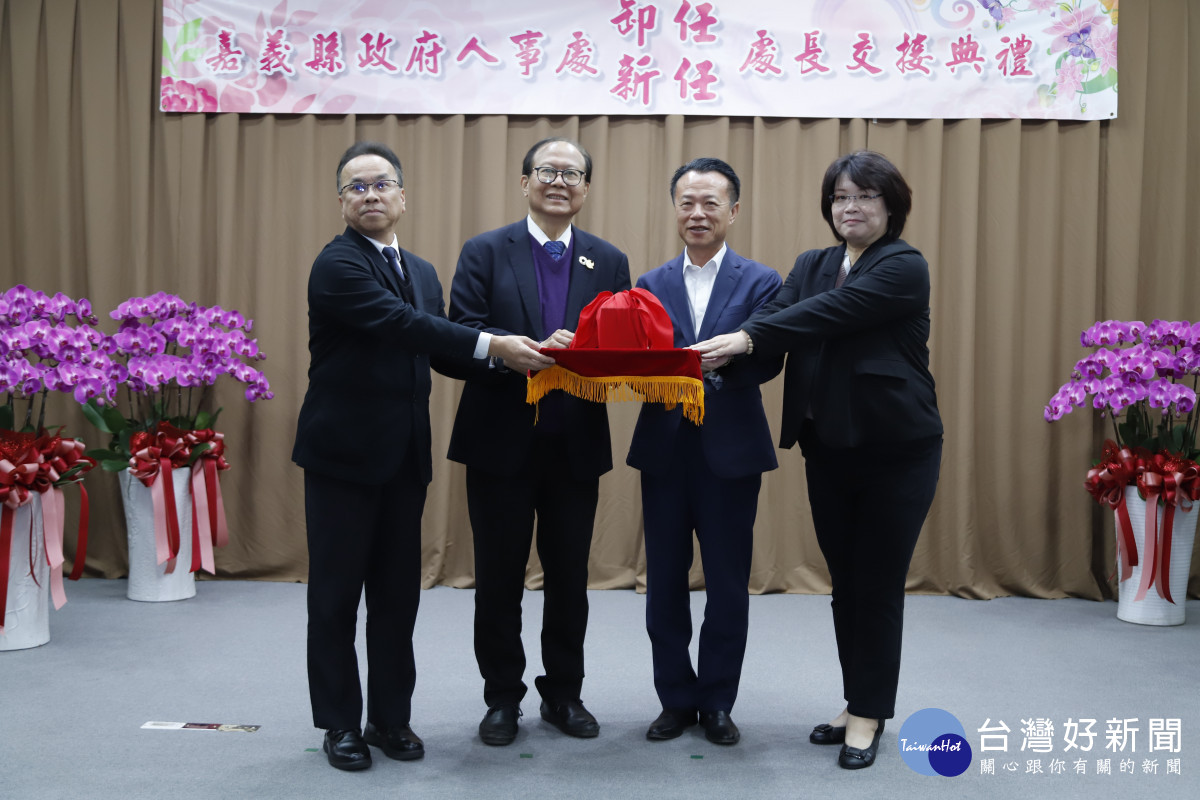 嘉義縣政府原人事處長楊景丞榮陞台南市政府人事處副處長,由嘉義縣議會人事室主任徐嬿玲接任人事處長,今天(5日)縣長翁章梁主持交接典禮,行政院人事行政總處人事長蘇俊榮親臨監交。