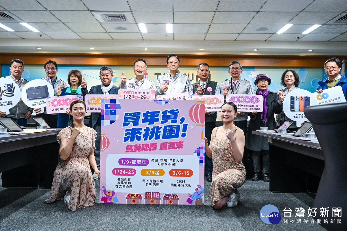 張善政說,除舊城活動外,2月4日至22日將於全市16處公有市場推出「馬上有福」系列活動,自南門市場起跑,規劃市場妝點、年貨福袋、優惠活動及打卡好禮,並同步發送超過6萬個桃園專屬馬年紅包袋;重頭戲「2026桃園年貨大街」則將於2月6日至15日,分別在桃園藝文廣場及中壢銀河廣場盛大登場。