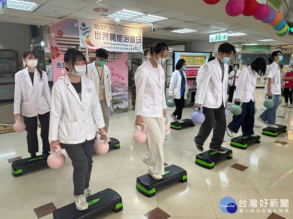 桃療職能治療師親自示範下肢阻力性登階訓練。(桃療提供)